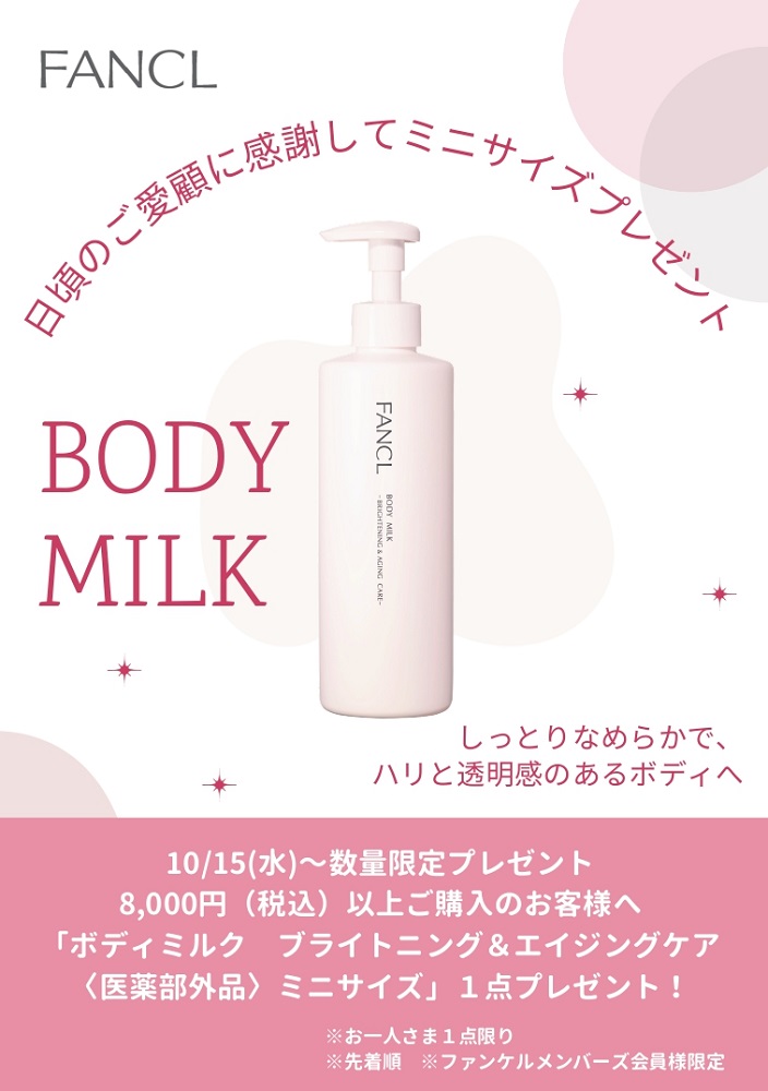 8,000円(税込)以上ご購入のお客様へ「ボディミルク ブライトニング&エイジングケア〈医薬部外品〉ミニサイズ(60g)」を1点プレゼントいたします🎁✨