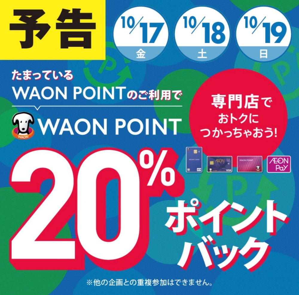 たまったWAON POINTをイオンモール専門店のWAON POINT加盟店でご利用いただくと、後日、ご利用いただいたWAON POINTの20%をポイントバック!