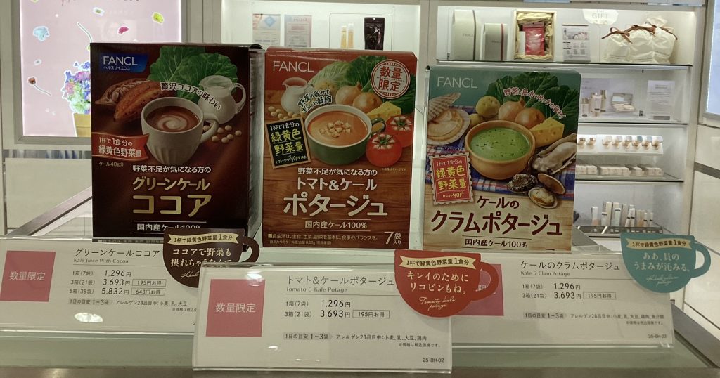 ①数量限定グリーンケールココア、ケールのクラムポタージュ、トマト&ケールポタージュの3種類。